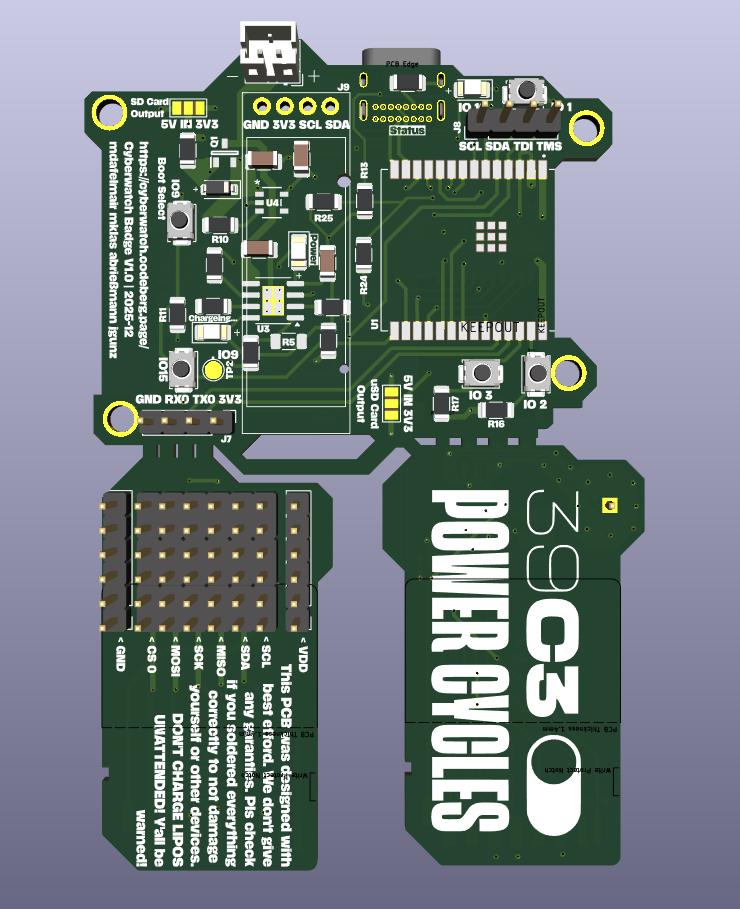 During our time tinkering with the design, we ended up reducing the size of the motherboard, to be able to add the daughter boards in the design and being able to get them produced together in one go from the manufacturer. And it started to look like a smartwatch, so we decided to name it "Cyberwatch", being the big cyberpunk fans we are. Of course the daughter boards could only be named "shards".